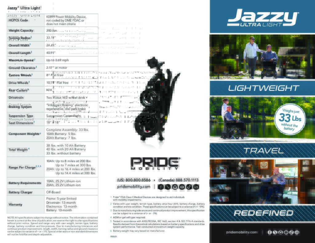 Easy fold design that locks into a folded position Weighs just 33 pounds without the battery Mesh back and seat with standard cushion for extra support Powered by an airline compliant** lithium battery (10AH Only)